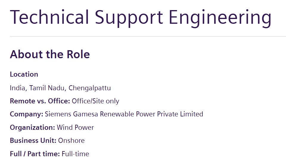 Siemens Gamesa Renewable Energy Careers Fresher & Experience Job Vacancy: Siemens Gamesa Renewable Energy is hiring for the Profile of Technical Support Engineering in Tamil Nadu, Chengalpattu location. This Opportunity is offer for fresher & Experience students.
